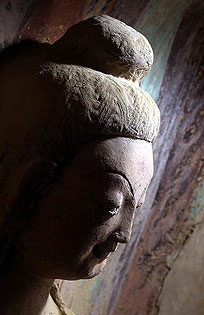 敦煌鳴沙山缺乏堅(jiān)硬的巖石,所以從一開始就是泥塑。北朝時(shí)期,敦煌泥塑塑像有釋迦佛、肋侍菩薩、釋迦苦修、禪僧等題材,造型上也受犍陀羅藝術(shù)的影響。但第259窟正龕的釋迦牟 尼和多寶佛,右壁龕上的被譽(yù)為“東方蒙娜麗莎”的單身坐佛,俯身向前,含著微笑;第248窟的彩塑坐佛,衣褶流動,唇角上翹,一手拂膝,一手做手印。它們都已有中國特色。到西魏時(shí)出現(xiàn)了秀骨清像風(fēng)格,北周后逐漸變得豐滿,到了隋唐就愈加圓潤豐肥,形成了盛唐風(fēng)范。